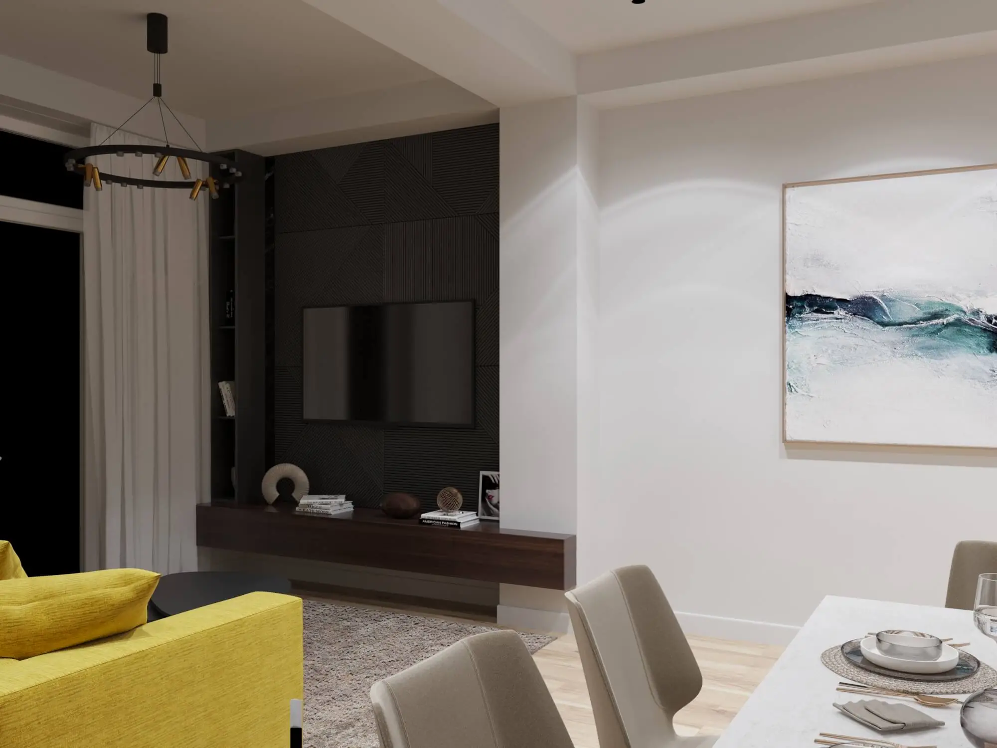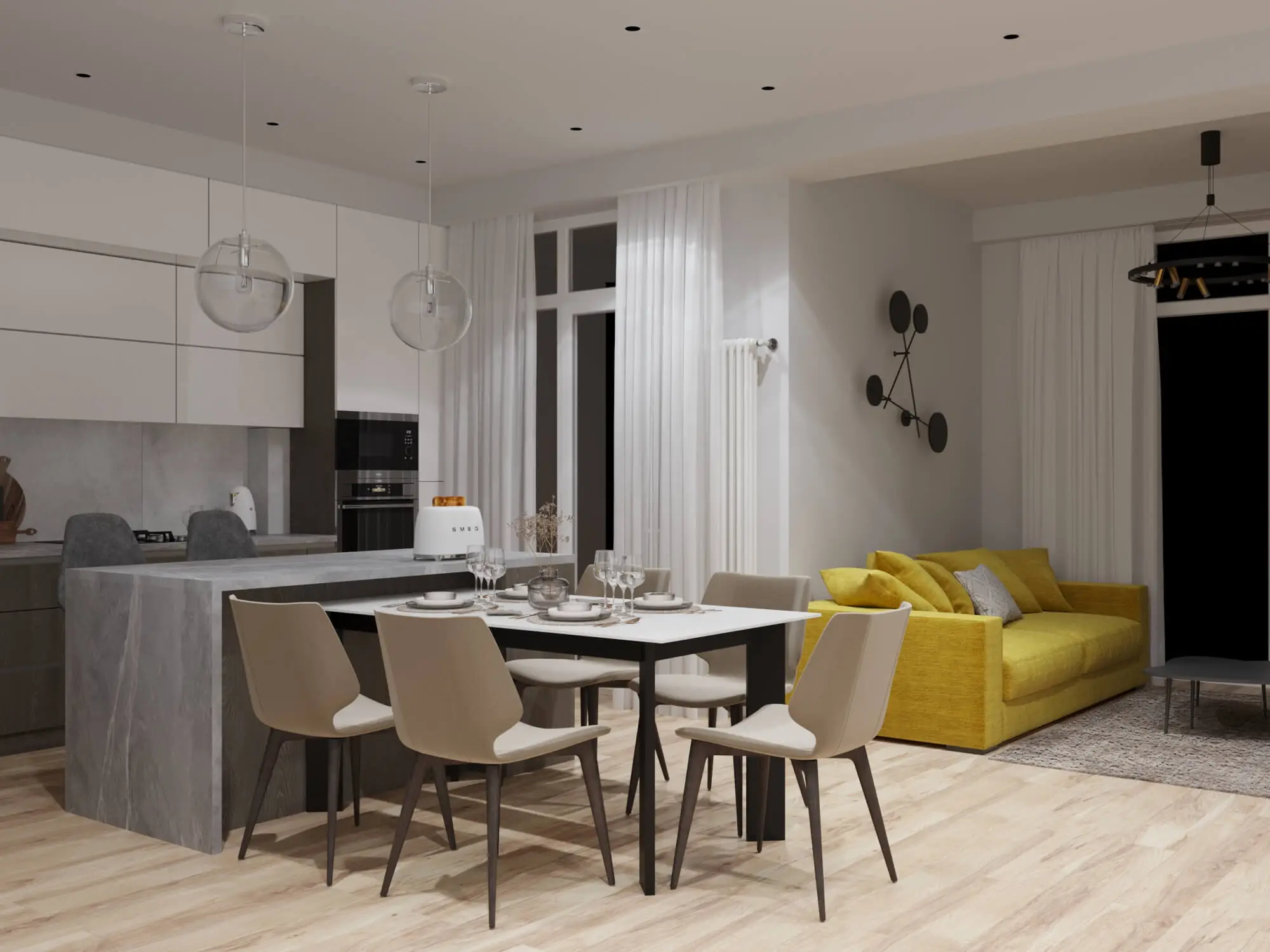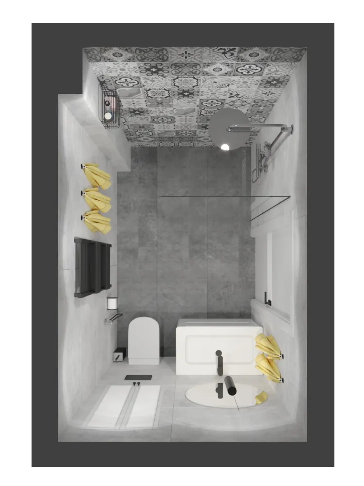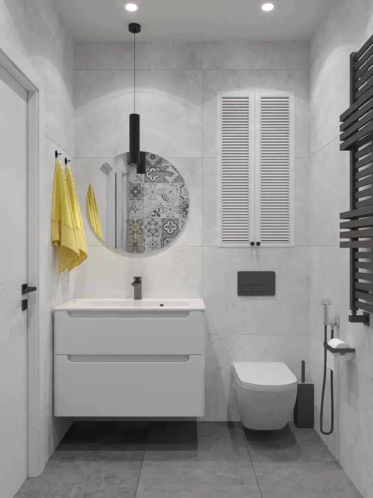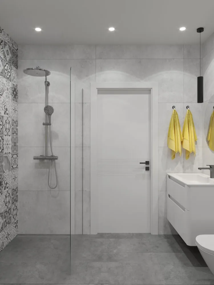 By admin_bondina / May 14, 2025 Grey Apartment with Yellow Details – bathroom, kitchen-living room Contact me