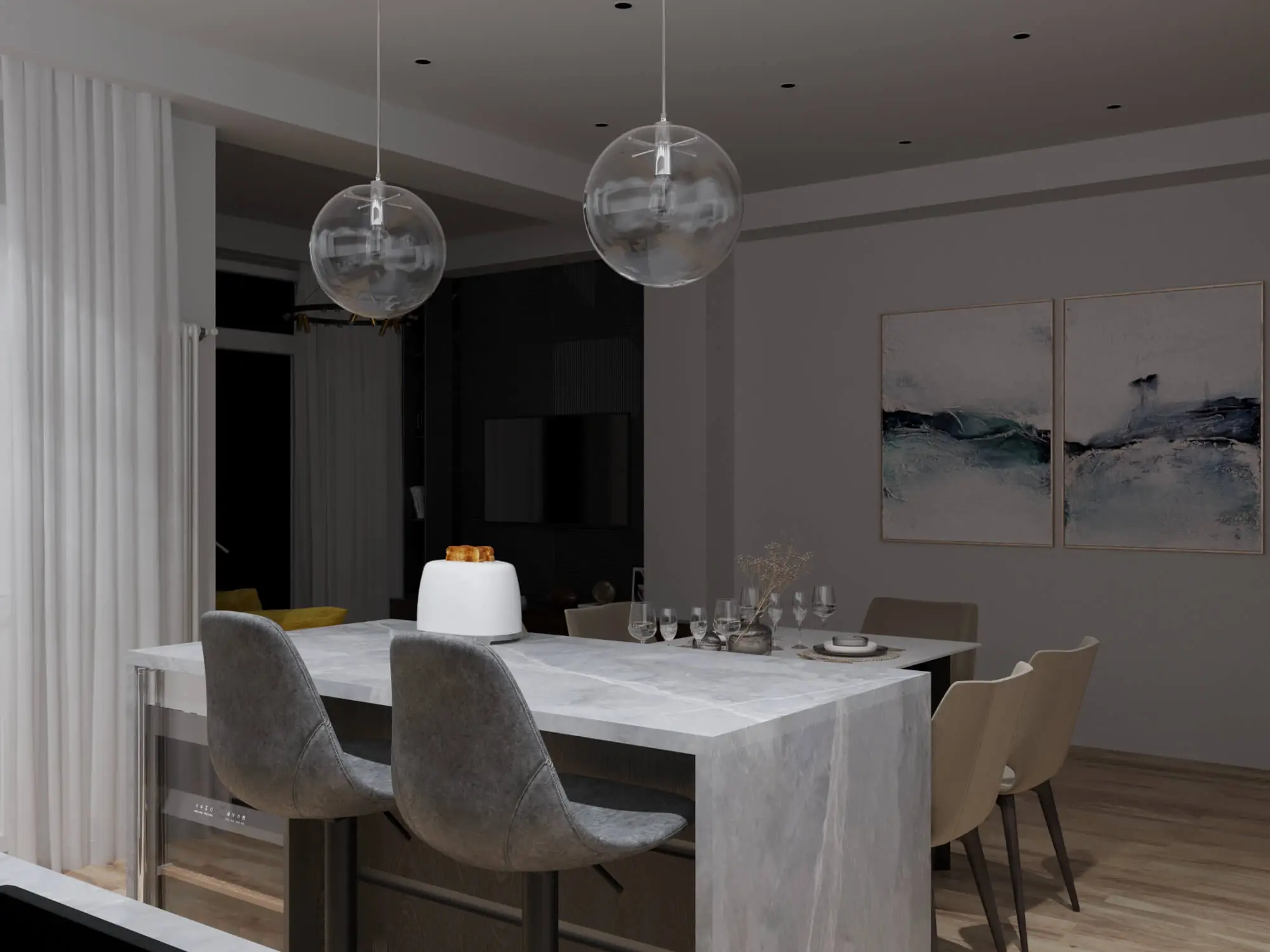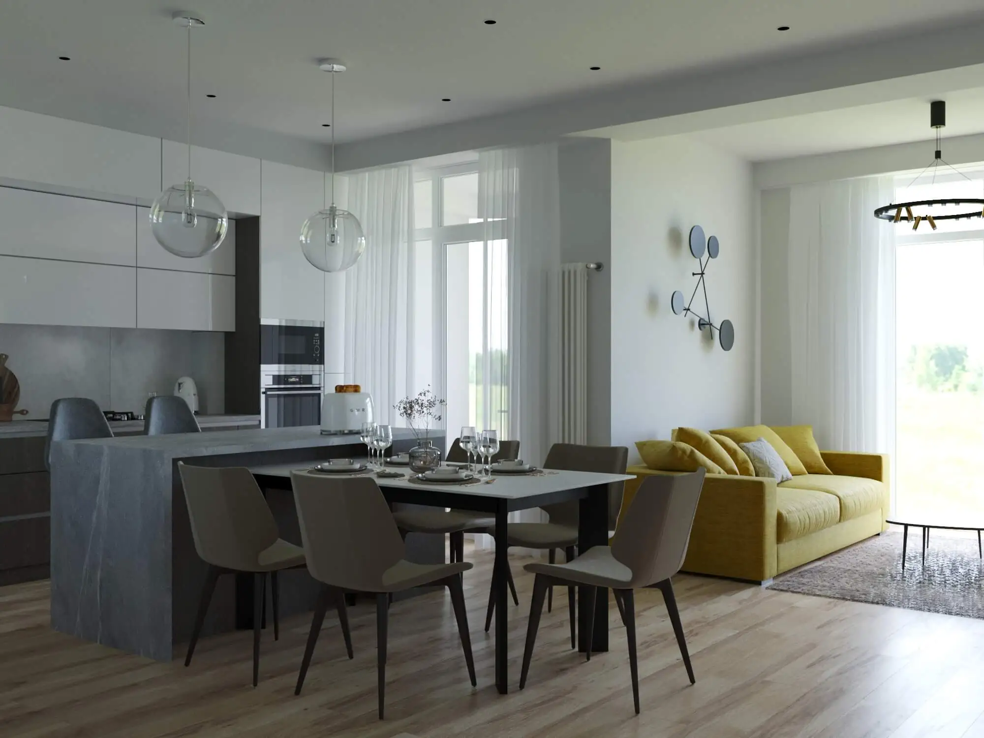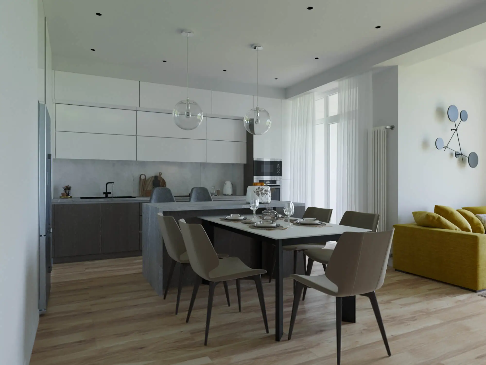 By admin_bondina / May 14, 2025 Grey Apartment with Yellow Details – bathroom, kitchen-living room Contact me